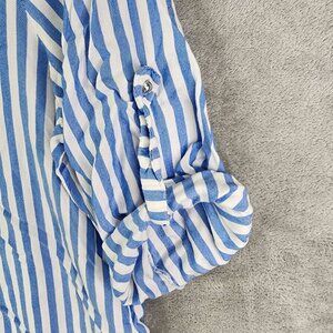 Womens Petite Ruby Rd. Blue & White Striped Blouse Top Rolled Tab Sleeve Size PL