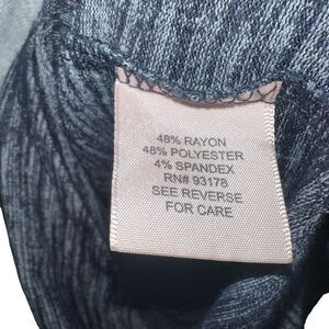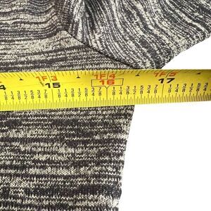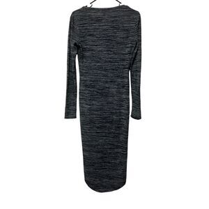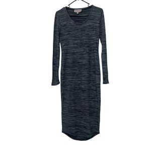 This is a pre-owned Philosophy Dresses long-sleeved dress in size S. It is made of 48% rayon, 48% polyester, and 4% spandex. The dress is a gray and blue marled knit with a round neckline and a fitted silhouette. It measures approximately 45 inches in length and 16.5 inches pit to pit. The dress is in good condition with no visible signs of wear or damage.