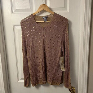 Introducing a touch of glamour with this Women’s Pierre Cardin Sequins Cardigan in a stunning Large size. Crafted from 100% rayon, this cardigan offers a luxurious feel and exquisite detailing. Adorned with sequins, it adds a sparkling touch to any ensemble, perfect for special occasions or adding a hint of elegance to everyday wear. In good condition and meticulously cared for, this cardigan is ready to make a statement in your wardrobe. Don't miss out on adding this glamorous piece from Pierre Cardin to your collection! See included pictures for measurements.
