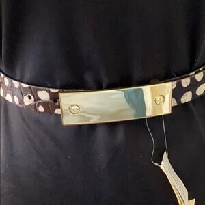 Pink texture on one side with dark brown animal print on the other. Gold buckle.