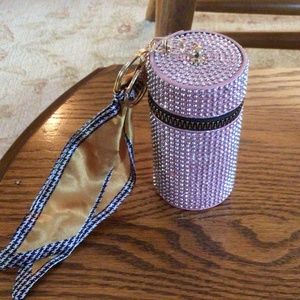 Fun sexy multipurpose bag charm with twilly comes to you in pink rhinestone studded detail. Solid zippered case perfect for your favorite lipstick and gloss or chapstick. Or keep that polish out of ur purse and store safely here.