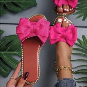 Women's Pink Brown Bow Knot Open Toe Slip On Slides Flat Slippers Sandals