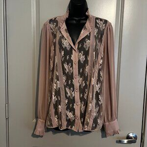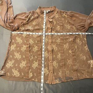 Women's Pink Button Up Blouse XL. Fits true to size, Cato brand. Lace details on front & sheer sleeve & back. Shirt is see through. Very versatile top! Great for work with a nice cami under or great for date night with a bralette under. 100% polyester shell & lining, 100% nylon contrast. Great pre-owned condition. There is one small snag on left upper sleeve & one small snag & one small discoloration on right sleeve - as shown in last two pictures.
