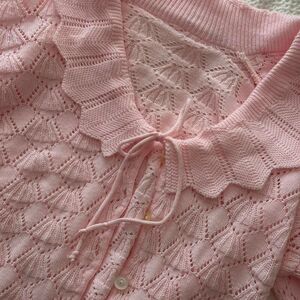 Vintage inspired light pink cardigan with peplum collar, tie front, and button detail 🤍🏹