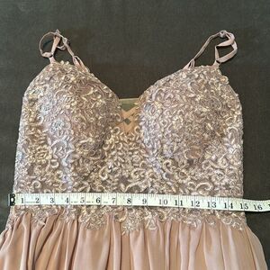 Women’s Pink Chiffon & Lace Appliqué Bridesmaid Dress Zip Up & Leg Slit Size 8