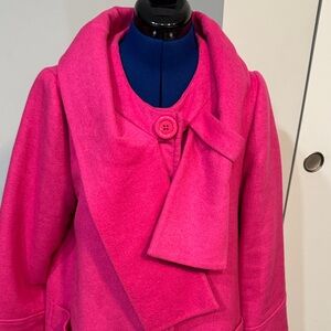 Stay stylish and warm with this vibrant pink coat. Perfect for any occasion.If you love pink and pea coats this is a match.Perfect for Fall/Winter seasons.This is a size small. Tiny satin at the back bottom detail right side.Large patch pockets at front.Huge button detail, comes with 4 snap closures.Beautiful cross over bow design at neckline with a gorgeous black and white inner lining.