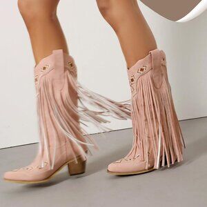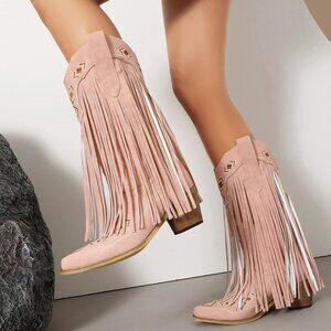 ⚡Women's Pink Embroidered Fringe Pull On Mid Calf Block Chunky Heel Pointed Toe