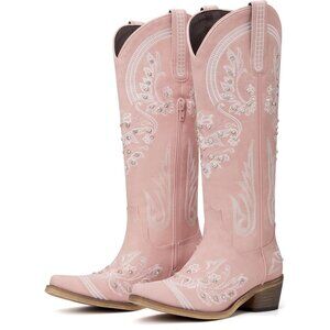 Women's Pink Embroidered Rhinestones Knee High Pointed Toe Cowgirl Boots