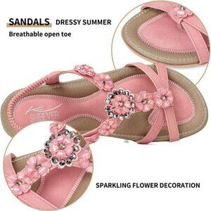 Women pink sandals with soft material: Comfortable insole and non-slip rubber outsole, elastic back strap for easy slip on/off, cute women bohemian sandals dressy shoes. Pink sandals women, pink sandals for women dressy, walking sandals women comfort, comfort sandals for women.