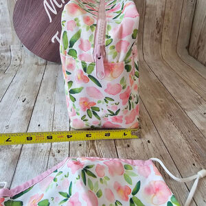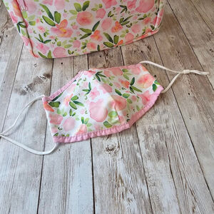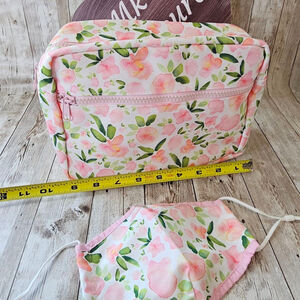 This new, without tags or box, set includes a cosmetic bag and a face mask. Both items feature a pink floral pattern on a white background. Its interior is lined with pink fabric. The face mask has elastic ear loops and a pink binding. No visible imperfections are present. Brand and model information are unavailable.
