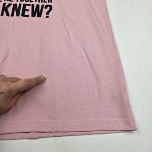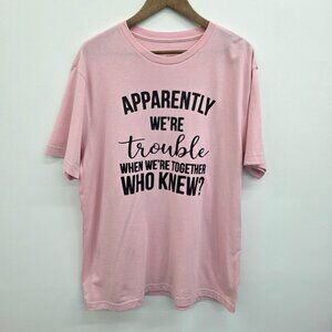 pink graphic tee XL, funny quote shirt, apparently we’re trouble t-shirt, casual short sleeve crewneck, lightweight recycled poly cotton blend, everyday casual wear, novelty graphic shirt, men’s XL tee pink, who knew trouble shirt