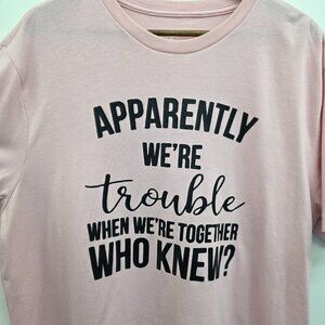 Womens Pink Graphic Funny Quote T-Shirt “Apparently We’re Trouble” Short Sleeve
