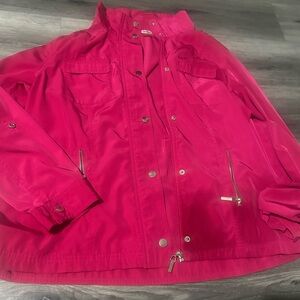 Stylish and vibrant pink jacket perfect for any occasion. Features a sleek design with convenient zippered pockets.little bit bright on pictures. Condition used
