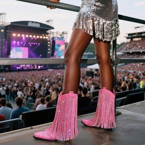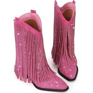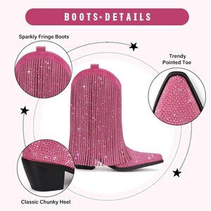 ⚡Women's Pink Mid Calf Cowgirl Boots With Star Studded Pointed Toe Chunky Heel