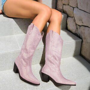 ⚡Women’s Pink Rhinestone Cowboy Boots Mid Calf Pointed Toe Block Heel