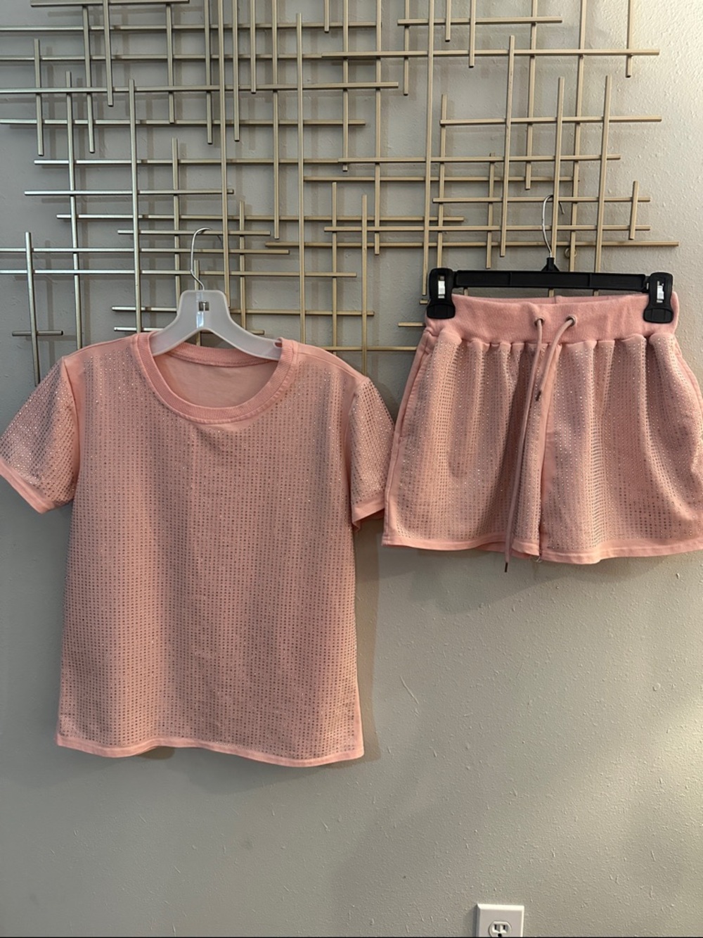 Soft pink rhinestones short-sleeve top and matching shorts. Lightweight and breathable for comfortable spring or summer look. Elastic drawstring waist on shorts for an adjustable fit. Easy-care fabric ideal for everyday wear.