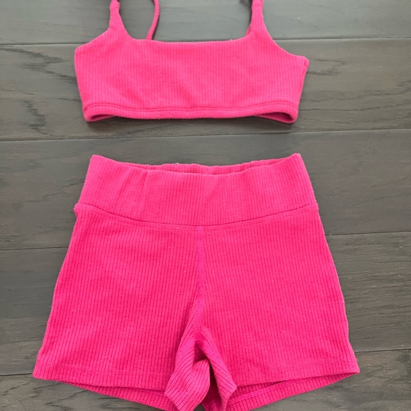 This stylish pink ribbed two-piece set is perfect for casual outings. The set includes a comfortable crop top and matching shorts, offering both style and ease.