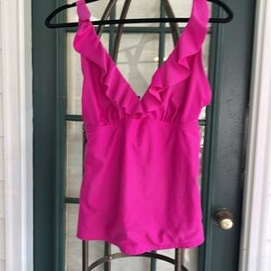 Stylish and vibrant pink swimsuit with elegant ruffle detailing. Perfect for a chic beach look.