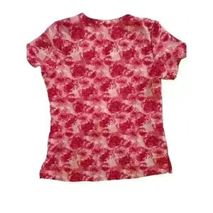 This women's scrub top is lovely and in excellent condition. Produced by Prints by Maevn, it features a rose, floral pattern in light pinks and dark pinks. It is a women's size small. It has a Vneck, and pockets for all the essentials. It is easy to move in, quick drying, and has a flattering, tailored shape. It is machine washable, tumble dry low.