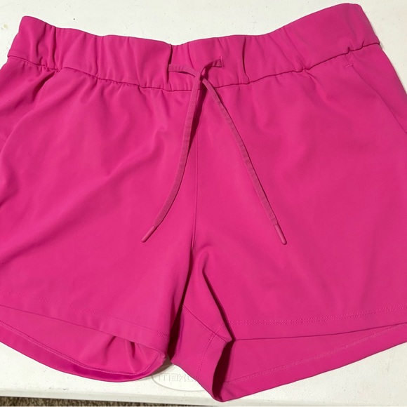 Don’t fit anymore. Only worn a few times. They are a hot pink with elastic waistband and ties. Comes from a home with pets
