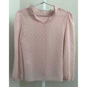 Womens Pink Top SIZE SMALL Sheer Swiss Dot Blouse Lace High Neck Long Sleeves