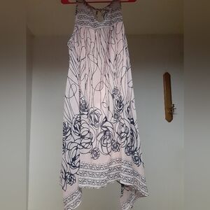Elegant pink dress with blue floral patterns. Features a flowy design and intricate detailing.