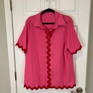 Shopping Tags: two piece set, pink and red, scallop trim, button up top, elastic shorts, trendy set, travel set, beach set, house set, errands set, pockets, vacation set, separates, matching, womens set