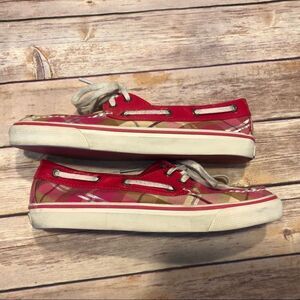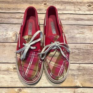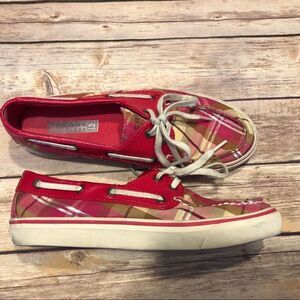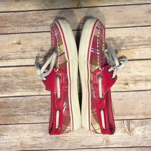 Gently used women’s Pink and silver plaid sperry top sider boat shoes size 6.5. Good condition.
