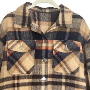 Women's Plaid Button Down Shacket S Beige Tan Navy Orange Brushed Flannel