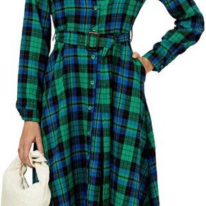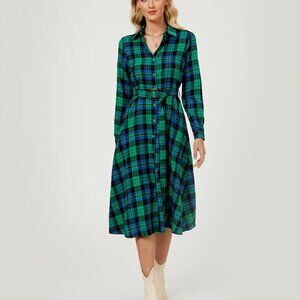 Women's Plaid Maxi Dress Long Sleeve Collared Belted Button Down Casual