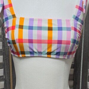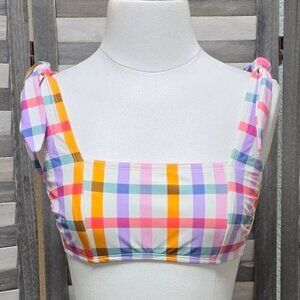 This bralette-style bikini top is covered with a timeless plaid pattern and is made with a mix of soft and stretchy fabric with opaque sheerness for total comfort.