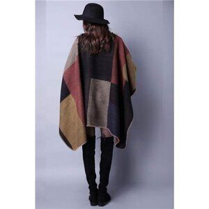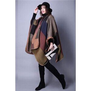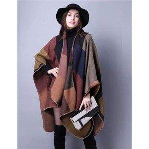 Women's Plaid Sweater Poncho Cape Coat Open Front Blanket Shawls and