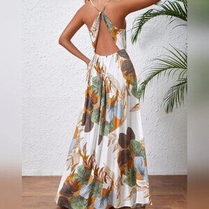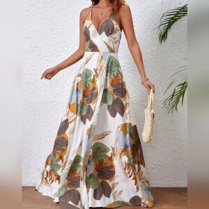 Women's Planted Printed High Side-Split Halter Woven Dress