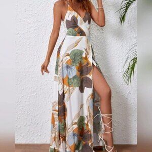 Women's Planted Printed High Side-Split Halter Woven Dress