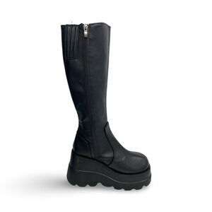 Edgy knee-high boots in sleek matte vegan leather with chunky 4.5” platform heel and square toe design. Women’s Size 5 Excellent Preloved excellent condition