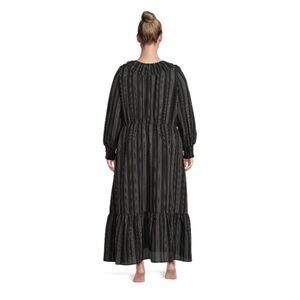 Material: 83% Rayon/17% Nylon Hammer Woven Texture • Care: Machine washable • Country of Origin: Imported • Size: Model is 5’11” and is wearing a size 1X • Fit: Relaxed • Length: Maxi • Closure: Pullover style • Sleeves: Long sleeves with variegated smocking cuffs • Pockets: Side-seam pockets • Features: Split neck with smocking and self drawcord; elastic waistband; tiered details; allover stripes
