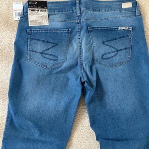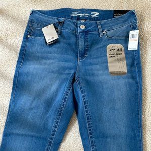 These are mid-rise micro boot jeans by Seven7 with tummyless technology which offers a slimmer tummy silhouette, slender waist and hips, and a smooth body appearance. There are both front and back pockets. The waist is a zipper and button closure. The material is 68% cotton, 21% polyester, 9% viscose and 2% lycra. They are machine washable. Made in Madagascar.