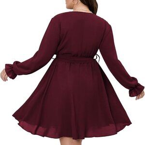Women's Plus Size 3XL Long Sleeve Wrap V Neck Tie Waist A Line Dress Burgundy