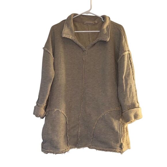 Keywords: women's jacket, plus size, beige jacket, fall fashion, oversized fit, raw-edge detailing, mid-length, casual wear, 3/4 sleeve, relaxed fit, cotton blend, solid color, pre-owned, women's fashion, versatile jacket.