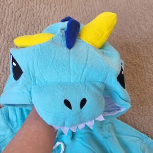 Stay cozy and playful in this dragon-themed one piece pajama costume. Made from soft fleece, it features a light blue body with a white tummy and yellow and blue accents for a fun, whimsical look. The hood includes a dragon head detail with a white drawstring, making it perfect for lounging, costume events, or chilly nights.