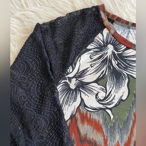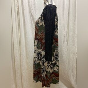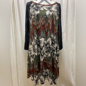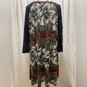 Women’s Plus Size Earth Tone Floral Trapeze Flowy Dress Lace Sleeve Pockets 3X