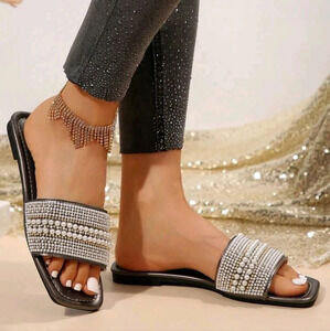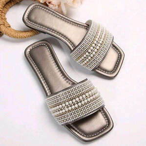 Women's Plus Size Flat Sandals With Rhinestone, Summer Beach Slippers