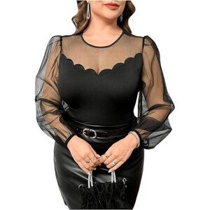 Women's Plus Size Mesh Tops Crew Neck Lantern Long Sleeve Scallop Trim Blouses