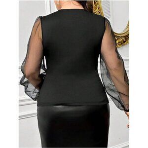 Features: Plus size, scalloped, lantern sleeve, round neck, mesh blouse for women