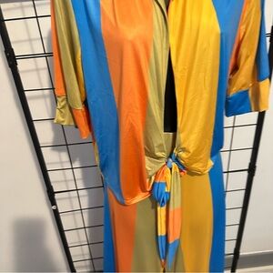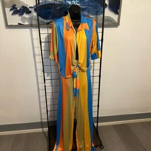 Two piece set, wide multi colored stripe, Crop top, Collar, V neck, Short sleeves, Self tie closure, High waisted pants, Elastic waistband, Wide legs, No closure. Inseam is 38 inches.