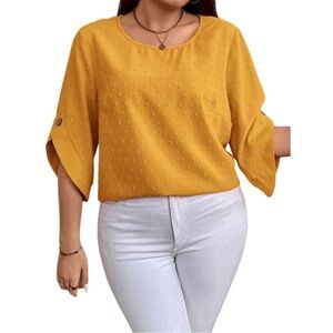 Women’s Plus Size Mustard Yellow Swiss Dot Flare Short Sleeve Blouse Top