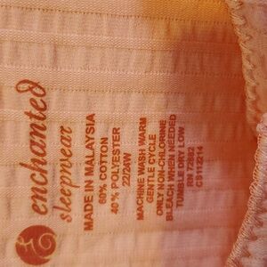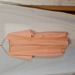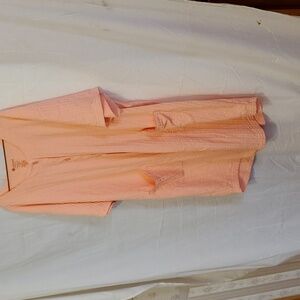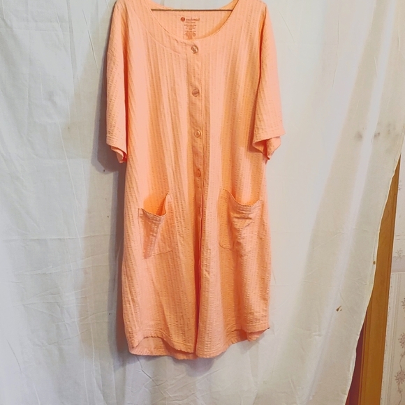 Peach-colored waffle weave robe with 2 front pockets.