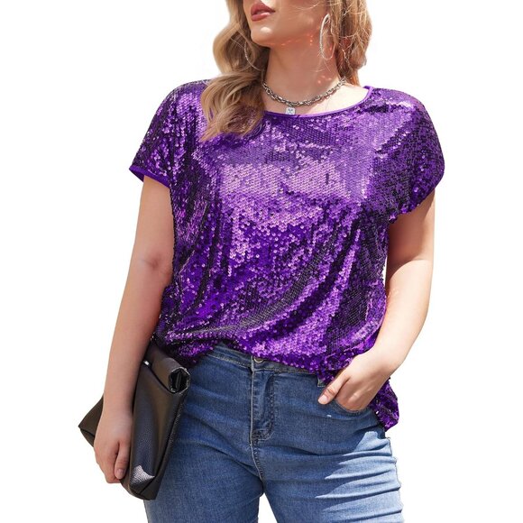 Women's Plus Size Sequin Top Short Sleeve Sparkle Glitter Crew Neck