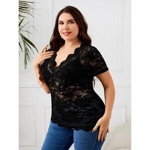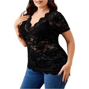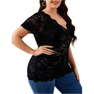 Women's Plus Size Short Sleeve Floral Lace Blouse Mesh V Neck Casual Top
