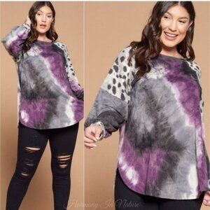 plus size top, tie-dye shirt, leopard print, casual top, long sleeve, Harmony In Nature, trendy wear, comfortable fit, XL size, polyester blend, purple top, stylish blouse, leopard print, tie dye